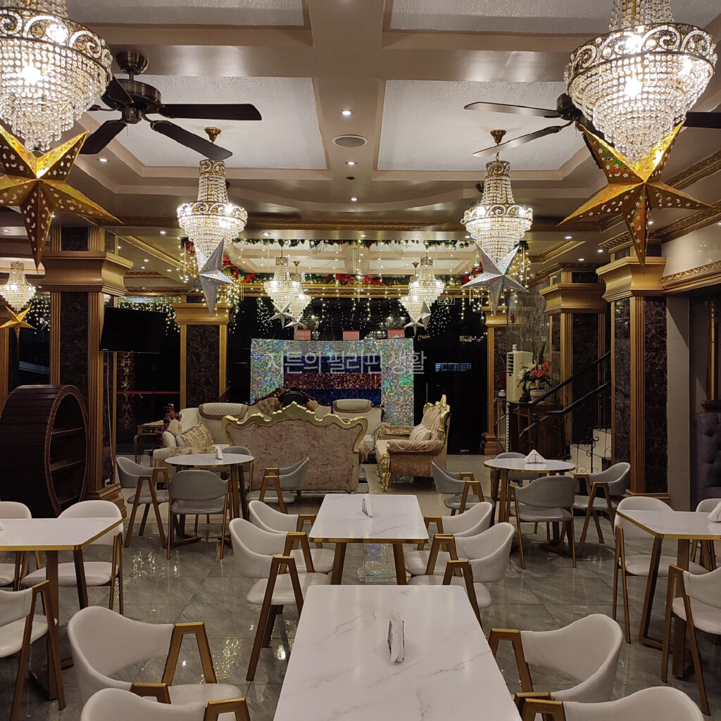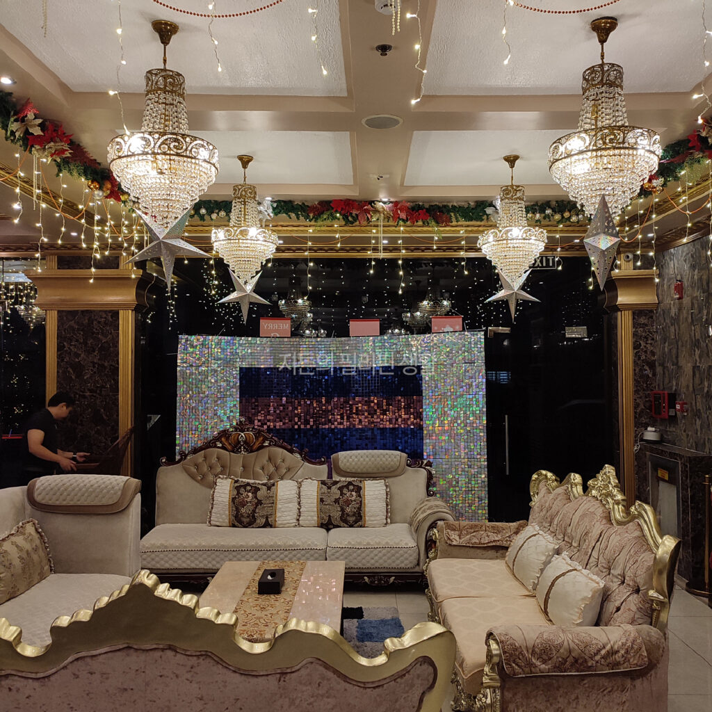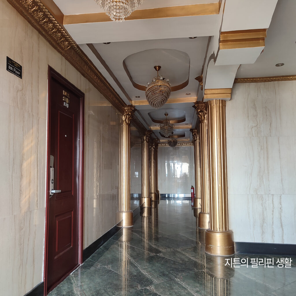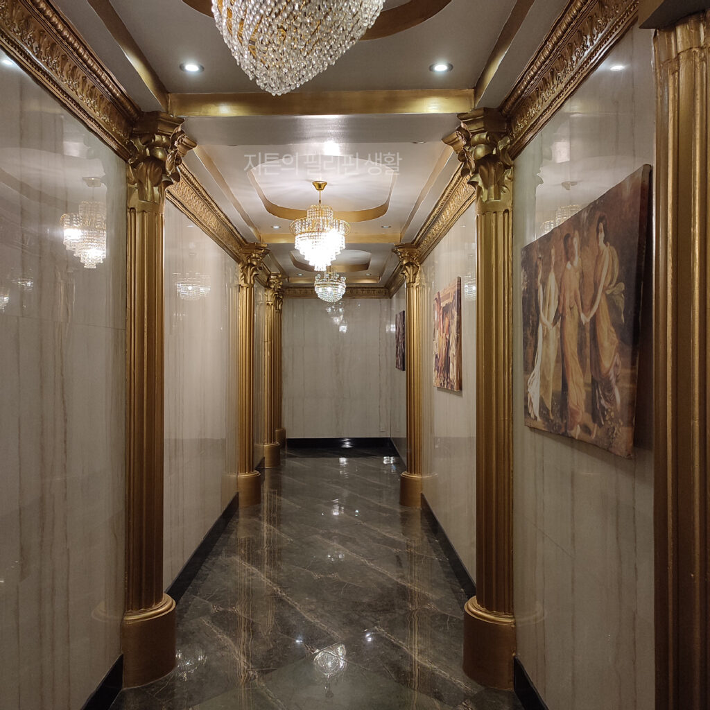 엘레베이터를 타고 올라가면 나오는 8층 복도입니다. 대리석 벽재와 바닥면, 아름다운 샹들리에와 르네상스풍의 그림으로 멋진 분위기를 연출하고 있습니다.