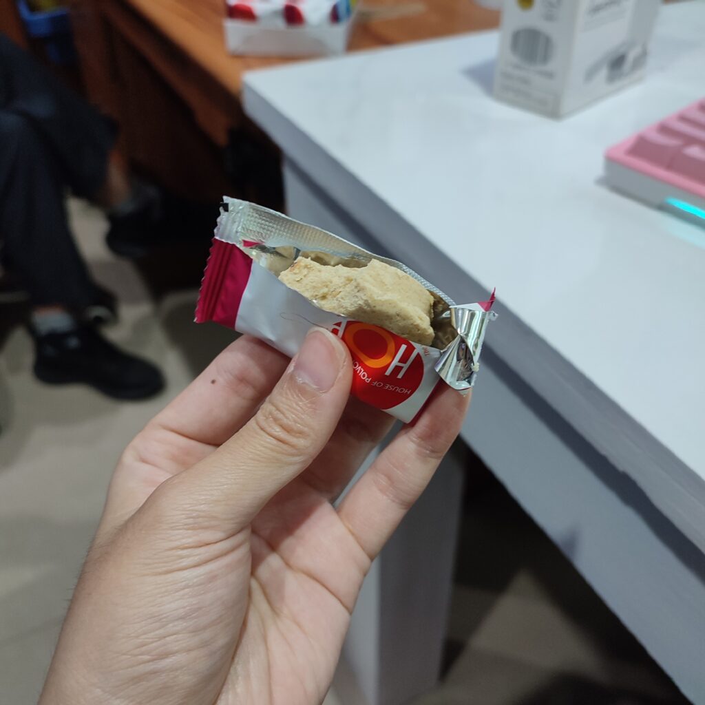 가루를 뭉쳐 놓은 듯한 느낌의 과자여서 바스라지기 쉬워 비닐 포장지를 뜯을 때부터 살살 다뤄야 합니다. 한입 먹을 때마다 가루가 많이 떨어지니 조심히 먹으세요.